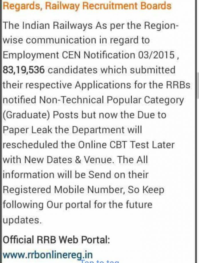 RRB has rescheduled the NTPC 2016 Exam due to Paper Leak, the department will reschedule the on-line CBT Test Later with New Dates and Venue.The revised date and venue will be communicated to the candidates shortly.