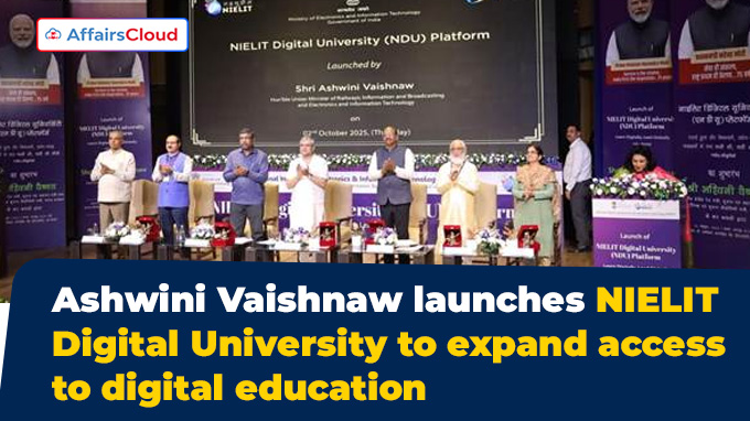On October 2, 2025, Union Minister Ashwini Vaishnaw, Ministry of Electronics and Information Technology (MeitY) and the Ministry of Railways (MoR), launched the ‘NIELIT Digital University (NDU)’, operated by the National Institute of Electronics & Information Technology (NIELIT), in New Delhi, Delhi.
